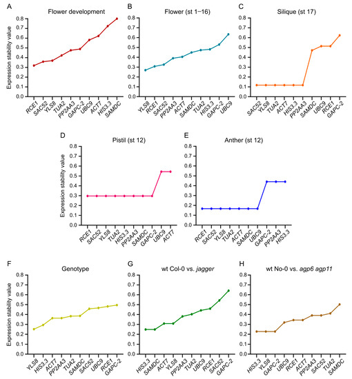Among the flower development group, RCE1 and SAC52 were the top two ranked genes, with an average SD of 0.63 and 0.64, while SAMDC (0.92) was the least stable gene (Figure 6A). YLS8 (0.52) and RCE1 (0.54) were the most stable genes in flower (st 1–16) samples (Figure 6B), while YLS8, SAC52, TUA2, HIS3.3, PP2AA3 and ACT7 (0.26) were the most stable genes in silique (st 17) samples (Figure 6C). YLS8, SAC52, TUA2, HIS3.3, PP2AA3, GAPC-2, RCE1 and SAMDC (0.38) were the most stable genes in pistil (st 12) samples (Figure 6D), whilst YLS8, SAC52, TUA2, RCE1, SAMDC, ACT7 and UBC9 (0.19) were the most stable genes in anther (st 12) samples (Figure 6E). UBC9 (0.75) was the worst gene in flower (st 1–16), while GAPC-2 (0.67) was the least stable gene in silique (st 17) samples (Figure 6C). UBC9 and ACT7 (0.62) were the least stable genes in the pistil (st 12) subset (Figure 6D), while GAPC-2, PP2AA3 and HIS3.3 (0.45) were the least stable genes in the anther (st 12) subset (Figure 6E).