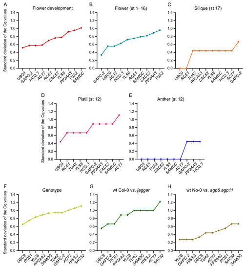 Standard deviation (SD) of the Cq values of ten candidate reference genes calculated by BestKeeper in the RefFinder software. (A) SD values of the ten candidate reference genes in the flower development group which included 21 samples corresponding to flower (st 1–16), silique (st 17), pistil (st 12), and anther (st 12) samples. (B) SD values of the ten candidate reference genes in 12 flower (st 1–16) samples which included flower st 1–6, flower st 7–12, flower st 13–14, and flower st 15–16 samples. (C) SD values of the ten candidate reference genes in the three silique (st 17) samples. (D) SD values of the ten candidate reference genes in the three pistil (st 12) samples. (E) SD values of the ten candidate reference genes in the three anther (st 12) samples. (F) SD values of the ten candidate reference genes in the genotype set that comprised 12 samples corresponding to wt Col-0, jagger, wt No-0 and agp6 agp11 samples. (G) SD values of the ten candidate reference genes in six wt Col-0 vs. jagger samples that included three wt Col-0 and three jagger samples. (H) SD values of ten candidate reference genes in six wt No-0 vs. agp6 agp11 samples which included three wt No-0 and three agp6 agp11 samples. The genes are arranged from the most to the least stable gene (from left to right). Abbreviations: Col-0, Columbia-0; No-0, Nossen-0; st, stage; wt, wild-type.