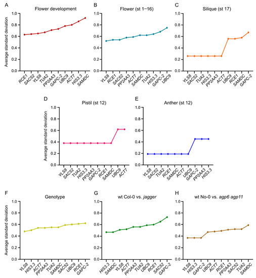 Average standard deviation (SD) of the ten candidate reference genes calculated by the ΔCt in the RefFinder software. (A) SD values of the ten candidate reference genes in the flower development group which included 21 samples corresponding to flower (st 1–16), silique (st 17), pistil (st 12), and anther (st 12) samples. (B) SD values of the ten candidate reference genes in 12 flower (st 1–16) samples which included flower st 1–6, flower st 7–12, flower st 13–14, and flower st 15–16 samples. (C) SD values of the ten candidate reference genes in the three silique (st 17) samples. (D) SD values of the ten candidate reference genes in the three pistil (st 12) samples. (E) SD values of the ten candidate reference genes in the three anther (st 12) samples. (F) SD values of the ten candidate reference genes in the genotype set that comprised 12 samples corresponding to wt Col-0, jagger, wt No-0 and agp6 agp11 samples. (G) SD values of the ten candidate reference genes in six wt Col-0 vs. jagger samples that included three wt Col-0 and three jagger samples. (H) SD values of ten candidate reference genes in six wt No-0 vs. agp6 agp11 samples which included three wt No-0 and three agp6 agp11 samples. The genes are arranged from the most to the least stable gene (from left to right). Abbreviations: Col-0, Columbia-0; No-0, Nossen-0; st, stage; wt, wild-type.