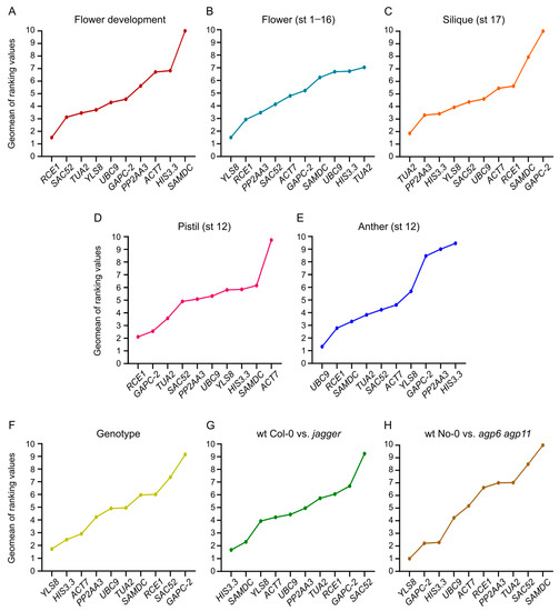 Comprehensive ranking values of the candidate reference genes obtained from geNorm, NormFinder, BestKeeper and ΔCt. (A) Ranking values of the ten candidate reference genes in the flower development group which included 21 samples corresponding to flower (st 1–16), silique (st 17), pistil (st 12), and anther (st 12) samples. (B) Ranking values of the ten candidate reference genes in 12 flower (st 1–16) samples which included flower st 1-6, flower st 7–12, flower st 13–14 and flower st 15–16 samples. (C) Ranking values of the ten candidate reference genes in the three silique (st 17) samples. (D) Ranking values of the ten candidate reference genes in thethree pistil (st 12) samples. (E) Ranking values of the ten candidate reference genes in the three anther (st 12) samples. (F) Ranking values of ten candidate reference genes in the genotype set that comprised 12 samples corresponding to wt Col-0, jagger, wt No-0 and agp6 agp11 samples. (G) Ranking values of the ten candidate reference genes in six wt Col-0 vs. jagger samples that included three wt Col-0 and three jagger samples. (H) Ranking values of the ten candidate reference genes in six wt No-0 vs. agp6 agp11 samples which included three wt No-0 and three agp6 agp11 samples. The genes are arranged from the most to the least stable gene (from left to right). Abbreviations: Col-0, Columbia-0; No-0, Nossen-0; st, stage; wt, wild-type.