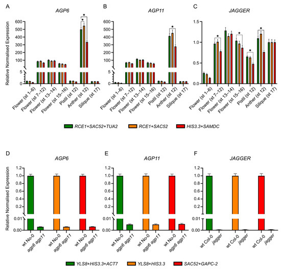 Relative expression levels of AGP6, AGP11 and JAGGER normalised by the three most stable reference genes (green bars), the two most stable reference genes (orange bars) and the two least stable reference genes (red bars) combinations. Relative expression levels of AGP6 (A), AGP11 (B) and JAGGER (C) in the flower development subsets, namely flower (st 1–6), flower (st 7–12), flower (st 13–14), flower (st 15–16), anther (st 12), pistil (st 12) and silique (st 17). The data correspond to the ratio of the expression compared with the silique (st 17). Relative expression levels of AGP6 (D) and AGP11 (E) in the wt No-0 vs. agp6 agp11 subset and JAGGER (F) in the wt Col-0 vs. jagger subset. The data correspond to the ratio of the expression compared with the wt No-0 for AGP6 and AGP11 or wt Col-0 for JAGGER. Error bars represent the standard error of the mean of three independent biological replicates, each with three technical replicates. Statistical analyses were performed using a two-way ANOVA followed by Dunnett’s multiple comparisons test. Asterisks represent statistically significant differences (α < 0.05) between the three different combinations of reference genes in each sample. Abbreviations: Col-0, Columbia-0; No-0, Nossen-0; st, stage; wt, wild-type.