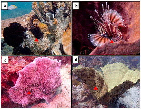 Numerous symbiotic macroscopic creatures reside inside or on the surface of a sponge. (a) Crinoid feather star, (b) Red lionfish, and (c,d) Synaptid sea cucumber.