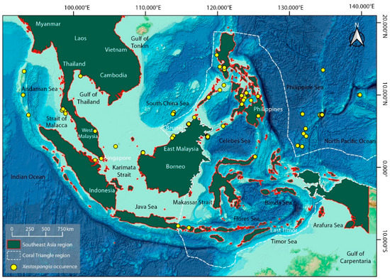 The location of Xestospongia spp. in Southeast Asia is indicated on the map. Malaysia, Indonesia, Thailand, Myanmar, Vietnam, Cambodia, Brunei, Singapore, Timor-Leste, and the Philippines are the nations that makeup Southeast Asia. Data for Xestospongia spp. (Yellow dots) are taken from the Ocean Biodiversity Information System (OBIS) (https://obis.org/; accessed on 25 December 2022) and recreated as a distribution map from the GEBCO World Map 2014. (www.gebco.net; accessed on 25 December 2022).