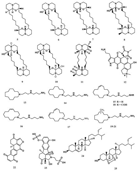 The metabolites identified in X. exigua exhibited diverse chemical structures, including alkaloids, quinones, and sterols [61,62,63]. The compounds (+)-xestospongin (A–D) (5-8) and (+)-araguspongines K (9) and L (10) exhibited vasodilation activity [62,63]. Similarly, xestosin A (11), a new bis-quinolizidine alkaloid, was isolated from X. exigua collected in Papua New Guinea [60]. Exiguamine A. (12) displayed inhibition of indoleamine-2,3- dioxygenase [64]. Other compounds isolated from X. exigua such as motuporamines A- I (13-21) displayed cytotoxicity against human cancer cell lines [65]. According to the literature, Motuporamines G, H and I (19-21) shared identical chemical structures and varied in chemical shifts. Halenaquinone (22) displayed antibacterial properties [52]. Exiguaquinol (23) showed inhibition of Helicobacter pylori glutamate racemase (MurI) with an IC50 value of 4.4 μM. MurI catalyses the conversion of L and D-glutamate, supplying D-glutamate for integration into the elongating peptidoglycan chain that constitutes the cell walls [51]. Clionasterol (24) and 5α,8α-Epidioxy-24αethylcholest-6-en-βb-ol (25) were reported to inhibit the human complement system [53]. The compound 25 also exhibited anti-inflammatory properties. At the mRNA and protein levels, 25 reduced the liposaccharide-induced production of inflammation mediators involved in the NF-κB pathway, including tumour necrosis factor-alpha (TNF-α), interleukin 6 (IL-6), and cyclooxygenase-2 (COX-2) [66]. The chemical structures of compounds reported from X. exigua are displayed in Figure 6.