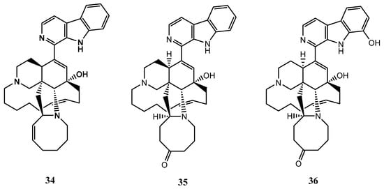 X. ashmorica is a marine sponge found in the Manila Channel off Mindoro Island in the Philippines. In 1996, researchers isolated three alkaloids from this sponge, named manzamine A (34), manzamine E (35), and manzamine F (36). These alkaloids were found to have cytotoxic properties against L5178 mouse lymphoma cells at a concentration range of 0.3 to 20 μg/mL. The median effective dose (ED50) for compounds 34-36 were 1.8, 6.6 and 2.3 g/mL respectively, showing that all the compounds were active against the selected cell line [42]. The structures of the compounds 34-36 from X. ashmorica are illustrated in Figure 8.