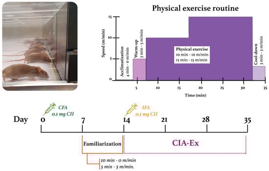 Mice from the CIA-Ex group were exercised for three weeks with a frequency of five 35 min sessions per week (Monday to Friday). The PE session included the phases of (1) acclimatization: mice were placed for 4 min on the switched-off treadmill; (2) warm-up: mice walked for 3 min at 5 m/min; (3) PE: mice ran for 10 min at 10 m/min, followed by 15 min at 15 m/min; and (4) cool-down: mice walked for 3 min at 3 m/min. Treadmill PE intervention started when the clinical arthritis score was ≤1, the day after the second collagen injection. Mice from both groups were euthanized with isoflurane on day 35 (Figure 1).