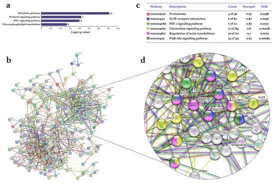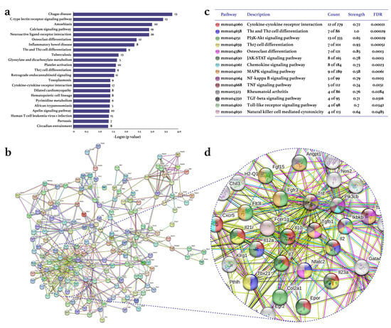 Effect of physical exercise on transcriptomic down-expression in tarsal joints of mice with collagen-induced arthritis. The lists of the down-expressed genes in the CIA-Ex mice with respect to control (Z-score ≥ 1.5 SD) were analyzed on DAVID bioinformatics resource, STRING database, and Cytoscape software (n = 8 mice per group). (a) The associated KEGG pathways (p ≤ 0.05) in DAVID are shown in the bars that indicate the -Log10 (p-value) and the number of genes on the right side of each bar. (b) The primary clusters of sub-networks found with the Molecular Complex Detection (MCODE) complement (cutoff = 0.4) to obtain the protein–protein interaction (PPI) network. (c) KEGG signaling pathways relevant in arthritis. (d) Amplification of the nodes with the most significant interaction in the selected pathways. FDR: false discovery rate.