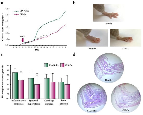 Clinical and histological effects of treadmill physical exercise in the preclinical collagen-induced arthritis in DBA/1 mice. (a) Evaluation of the clinical course of arthritis. Erythema and swelling were evaluated using the semiquantitative scale from 0 to 4 in each paw and the sum of the four paws per mouse was obtained. The mean score and standard deviation were calculated and graphed for each group during the experimental intervention. (b) Representative images of the clinical manifestation of CIA in control and exercised mice. (c) Histological evaluation in the hind paws by H&E staining. Inflammatory infiltrates, synovial hyperplasia, cartilage damage, and bone erosions were evaluated using the semiquantitative scale from 0 to 4. The mean score and standard deviation were calculated and graphed for each group. (d) Representative images of the histological findings in the hind paws using H&E staining. The Mann–Whitney U test was used to determine statistically significant differences when p < 0.05. * p ≤ 0.05; ** p ≤ 0.01.