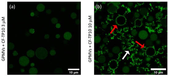 In Figure 1, the representative 1024 × 1024-pixel LSCM images of GPMVs after 20 h of incubation with (a) 3 μM and (b) 10 μM TP10 labeled with carboxyfluorescein (CF-TP10) are reported. The fluorescence signal of CF-TP10 is represented in green. Figure 1a shows the fluorescence signal colocalized with the GPMVs vesicles, which maintain a regular spherical shape and are quite homogenously colored in green. The GPMV shape is not changed with respect to that observed for the freshly prepared ones (see Figure S1 for comparison). The fluorescence signal is mainly localized within the vesicles indicating that TP10 crosses the membrane accessing the internal compartment. This is not surprising since TP10, being part of the CPPs family, is known in the literature to penetrate membranes alone or with molecular cargo [10,11,12,13,14]. Figure 1b reveals that at higher peptide concentrations (10 μM), although some vesicles retain their integrity, others (indicated by red arrows) present a clearly modified morphology. Furthermore, the white arrow highlights the presence of amorphous structures in the sample, characterized by higher intensity, which could represent lipid–peptide co-aggregates deriving from vesicle disruption. It is also interesting to observe in Figure 1b that the vesicles exhibiting a modified morphology (red arrows) do not show a fluorescence signal inside but present a higher fluorescence signal at the edges with respect to intact vesicles. This could result from an accumulation on/or insertion of the peptide on/in the bilayers coupled or not to efflux of the inner material, including the peptide. In line with previous results [13,30], it is possible to infer that this could be a consequence of the formation of pores in the membrane, which could also induce structural modifications including thinning and breakage. For example, experiments performed on DOPC:DOPG negatively charged giant unilamellar vesicles, using confocal fluorescence microscopy, showed the movement of the labeled peptide into the lumen, revealing the formation of pores and the occurrence of translocation phenomena [13]. All these processes require TP10–membrane interaction mediated by hydrophobic interactions and electrostatic forces due to the net positive charge of the peptide and the negatively charged lipids.