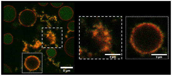 Figure 2 shows GPMVs labeled with NR (red channel) 20 h after the addition of 10 μM CF-TP10 (green channel). The fluorescence signals acquired in the two channels are clearly distinguishable in the intact vesicles with the green signal inside, delimited by the red one. On the contrary, a spatial overlap within the pixel resolution, between the green and red signal, is evident at the edges of the vesicles (highlighted with a dotted box) presenting a significantly modified morphology. This indicates that co-localization occurs (orange areas) between the lipid layer and TP10. As already observed in Figure 1b, the green fluorescent signal inside the vesicles with a modified membrane is lower with respect to the one on the lipid bilayer. This indicates the accumulation of peptides on the membrane.