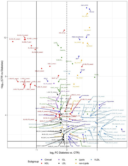 Figure 1 shows a volcano plot of the associations of diabetes with these clinical measures as well as 154 features measured by NMR spectroscopy of plasma. All p-values are adjusted for multiple testing. Interestingly, several NMR-measured features are significantly different between patients with T2DM and non-diabetic control subjects—notably, the increase in branched-chain amino acids, alanine, and lactate in plasma samples of T2DM patients. In contrast, we observed a significant decrease in plasma levels of most features related to very large HDL (XL-HDL), large HDL (L-HDL), or related with polyunsaturated fatty acids (linoleic acid, omega-6 fatty acids) and monounsaturated fatty acids. In contrast to most plasma HDL-related parameters, those related to small HDL particles (S-HDL), especially triglycerides in small HDL (S-HDL-TG), were increased rather than decreased in T2DM patients. Similar opposite associations were seen for features related to very small VLDL (except XS-VLDL-TG), which are decreased in patients with diabetes by contrast to features related to small (S-VLDL), medium (M-VLDL), large (L-VLDL), very large VLDL (XL-VLDL), and chylomicrons and extremely large VLDL (XXL-VLDL), which are increased in T2DM patients. In contrast to PUFAs, plasma levels of monounsaturated fatty acids (MUFAs) were higher in diabetics. It is also noteworthy that the inverse association of apoA-I was stronger if it was measured by NMR spectroscopy (marked in red) rather than by the clinical laboratory method (marked in blue).