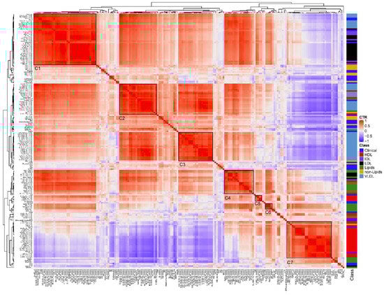 Correlation heatmap showing the correlations of clinical features and NMR parameters assessed in the control subjects. Red-blue heatmap reflects positive and negative correlations. Colors depicted in the vertical bar on the right side of the heatmap reflect subgroups of features: clinical findings and NMR features on VLDLs, LDLs, IDLs, HDLs, lipids in total plasma, and non-lipids. Cluster C1 encompasses apoB, non-HDL-cholesterol, LDL-cholesterol, and total cholesterol, as well as particle numbers, lipids, total, unesterified, and esterified cholesterol, and phospholipids of very small VLDL, IDL, small, medium, and large LDL. The cluster is loosely connected with glucose and HbA1c, as well as alanine, glutamine, phenylalanine, acetate, and lactate. Cluster C2 encompasses features of small and medium VLDL, triglycerides in total serum, very small, small, and medium VLDL, as well as small HDL and glycoprotein acetyls. This cluster is loosely connected with branched-chain amino acids, tyrosine, BMI, waist circumference, blood pressure, and CRP. Cluster C3 encompasses measures of large, very large, and extremely large VLDL. It is positively correlated with cluster C2 and, more loosely, with estimated glomerular filtration rate, histidine, albumin, and activities of liver enzymes. Cluster C4 contains triglycerides in total IDL, LDL, and HDL, as well as in small, medium, large LDL, very large HDL, and several features related to fatty acids, including total fatty acids, saturated fatty acids, docosahexaenoic acid, linoleic acid, MUFAs, PUFAs, omega-3 and omega-6 fatty acids. Moreover, it includes total, esterified, and unesterified cholesterol in plasma. Cluster C4 is connected with two smaller clusters, C5 and C6, and is loosely connected with age. Cluster C5 contains particle numbers, total and esterified cholesterol, and lipids of small HDL. Cluster C6 contains total phosphoglyceride, phosphatidylcholine, total cholesterol, and sphingomyelins. Cluster C7 encompasses apoA-I, citrate, and triglycerides in large HDL, lipids, phospholipids, total, unesterified, and esterified cholesterol, particle numbers of medium, large, and very large HDL, as well as total cholesterol in total HDL. It is loosely connected with unsaturated fatty acids, several fatty acid ratios, and cholesterol efflux capacity. Cluster C7 is inversely correlated with clusters C1, C2, and C3, as well as several features of cluster C4. Correlations with features of clusters C5 and C6 are mostly positive.
