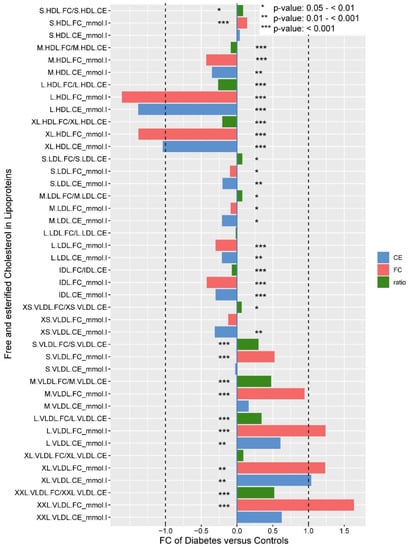 Bar plot showing associations of diabetes with free cholesterol (FC), cholesterol ester (CE), and the ratio of free cholesterol to total cholesterol in lipoprotein subclasses. Data are presented as multiples of the medians. Asterisks refer to the level of statistical significance as assessed by the Wilcoxon Test, adjusted by the Benjamin–Hochberg procedure: * p < 0.05; ** p < 0.01; *** p < 0.001.