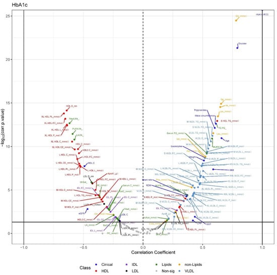 Volcano plot of correlations between HbA1c and all other parameters in the combined cohort of diabetic patients and non-diabetic controls. The x-axis reflects the coefficients of correlation. The y-axis depicts the level of statistical significance. The higher the location of a parameter in the graph, the higher the statistical significance of its correlation with HbA1c. The horizontal line reflects the threshold for statistical significance without adjustment for multiple testing. Only parameters with significant correlations are labeled with names. For abbreviations, see the list of abbreviations in Supplementary Table S1.