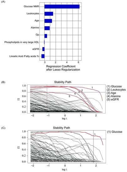 Next, we performed elastic net regularized regression and stability path analyses to find variables independently correlated with HbA1c (Figure 7). Figure 7A shows the non-zero regression coefficients after regularization for the parameters with significant correlation. Glucose, leukocytes, age, alanine, and glycoprotein acetyls showed independent positive correlations. In contrast, the concentration of very large HDL particles, eGFR, and the linoleic acid to total fatty acids’ ratio showed independent negative correlations. Upon stability path analysis, only the correlations of HbA1c with glucose, leukocytes, age, alanine, and eGFR remained significant (Figure 7B). Upon correction for multiple testing, only glucose remained significantly correlated with HbA1c (Figure 7C).