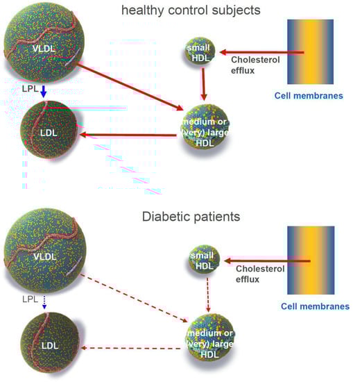 An alternative explanation for the enrichment of VLDL with free cholesterol is its impaired transfer to HDL. Kontush and colleagues previously demonstrated that the lipolysis of triglycerides is accompanied by the transfer of free cholesterol from triglyceride-rich lipoproteins to HDL, possibly as part of surface remnants [23,24]. This transfer is decreased in diabetes, probably as the result of disturbed lipolysis because insulin resistance limits the activity of lipoprotein lipase [23]. Such a disturbance explains both the accumulation of free cholesterol in VLDL and the decreased content of free cholesterol in HDL.