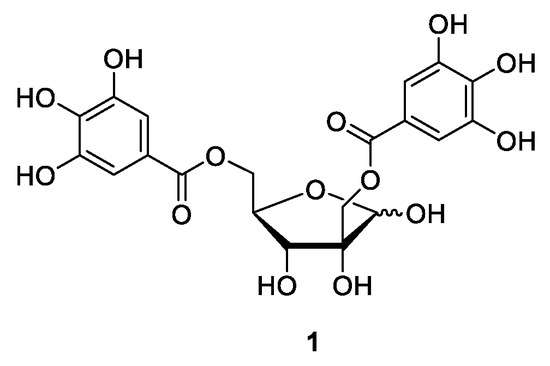 Hamamelitannin (2′,5-di-O-galloyl-2-C-(hydroxymethyl)-D-ribofuranose or 2,5-di-O-galloyl-D-hamamelofuranose, 1, Figure 1) is the main component of the witch hazel bark extract (Hamamelis virginiana L.) [7,8,9]. Different galloylhamameloses, have been isolated to date from the bark of various Fagaceae spp. such as Castanea crenata [10,11], Castanopsis cuspidate [12], or Castanea sativa [13]. Gallotannin 1 is commercially available pure or as a component of various organic extracts. For commercial use, it is usually isolated from witch hazel (Hamamelis virginiana) or sweet chestnut (Castanea sativa).
