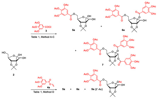 In one of our previous investigations, we studied ZnO as a convenient catalyst in the 4-O-acetylferuloylation of glycosides [58]. Therefore, we have examined tri-O-acetylgalloylation of 2 in CH2Cl2 (Table 1, Method C, Entry 6), but we isolated a mixture of acetylated monogallates as the main product fraction. Better results were obtained when we used CH3CN as the reaction medium (Table 1, Entry 7, 8). With elevating the reaction temperature to 40 °C, ZnO equivalents and reaction time lead to trigallate 7 a digallate 6a in the summary yield 83% (Table 1, Entry 8). It is interesting that we did not observe compound 7 as the β-anomer and 7α was the exclusive tri-O-acylated product under all conditions; this suggests the neighboring group effect by the C-2′ acyloxymethyl group in the rigid 2,3-isopropylidenated furanose ring, as has been already reported [59].