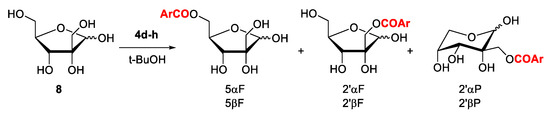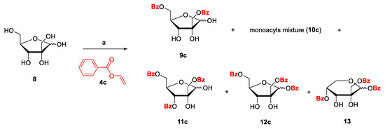 At first, we investigated the ability of Lipozyme to acylate 8 with a routine commercial aromatic donor—vinyl benzoate (4c). We were inspired by work [65] in which D-fructose benzoylated with vinyl benzoate (3 equiv.) using lipase from C. antarctica B (CAL) and lipase from Mucor miehei (MML) in t-BuMeO gave after 7 h 1,6-di-O-benzoyl-D-fructofuranoside (80%). In our hands, using 4 equiv. of benzoate 4c, a Lipozyme-catalyzed reaction in t-BuMeO for 50 h afforded di-O-benzoate 9c (37%), traces of monobenzoates 10c and a diverse mixture of tri-O-benzoates 11c, 12c, and 13 in 55% total yield (Scheme 3). The high proportion of variously benzoylated secondary hydroxyl groups, even the existence of tribenzoate 13 in pyranose form, indicated that the reaction with reactive hydrophobic aromatic donors would not be selective.