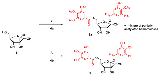 Enzymatic galloylation of hamamelose 8. Reagents and conditions: (a) vinyl 3,4,5-tri-O-acetylgallate 4a (3 equiv.), Lipozyme TL IM, t-BuMeO, 37 °C, 41 h, 9a (13%); (b) vinyl gallate 4b (3 equiv.), Lipozyme TL IM, t-BuMeO, 37 °C, 292 h, 1 (15%).
