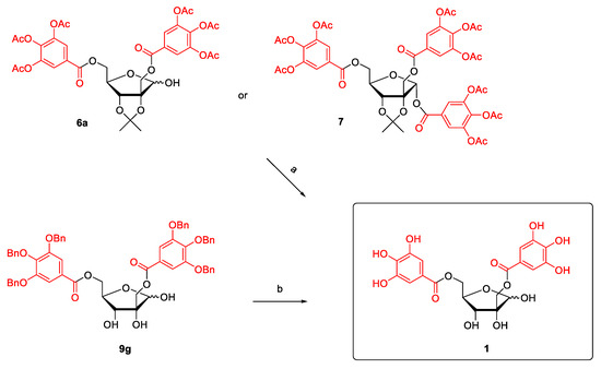 In the final step, the tri-O-acetylgalloylated compounds 6a, 7 and benzylgalloylated 9g were deprotected. Acidic conditions—3M HCl in CH3CN—were found to be sufficient for simultaneous deisopropylidenation and deacetylation, while the galloyl groups were retained. The product 1 from the deprotection of diacyl 6a was obtained as a pure compound in high yield (94%, conditions (a) in Scheme 7), while the reaction mixture obtained from the deprotection of compound 7 contained 1 and gallic acid. Gallic acid originated from deacylation of anomeric gallate moiety sensitive to acidic conditions. The disadvantage of this method was the long reaction time (3 days at laboratory temperature). Debenzylation of 9g by reductive cleavage with molecular hydrogen over 10% Pd/C proceeded smoothly. After 18 h, the reaction mixture was filtered through Celite 545, and after the concentration of the filtrate, hamamelitannin 1 was obtained with a 97% yield and satisfactory purity (conditions (b), Scheme 3).