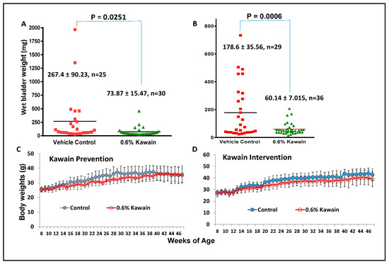 The mean wet bladder weights of surviving mice at the end of the experiment in the kawain diet group as a surrogate for tumor burden were reduced by 72.4% and 66.3% in the prevention and intervention protocols, respectively, compared to those of mice in the control diet group (Figure 2A,B, Ps = 0.0251 and 0.0006, respectively, in the prevention and intervention protocols). The mean body weights of the mice over time in the kawain diet group also appear to be slightly lower than those of the mice in the control diet group, but the differences are not statistically significant (Figure 2C,D). There are no significant differences in food consumption between the two groups (data not shown).