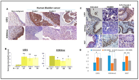 IHC analysis was used to examine expression levels of LSD1 and the methylation status of H3K4 in commercial tissue microarrays (TMA) containing 203 tissue samples from different stages of bladder cancer and 13 normal bladder tissue controls (Biomatrix, LLC, Plantation, FL, USA). Figure 4A,B show that LSD1 levels were equally elevated and mono-methylation levels of H3K4 were down-regulated in all three different grades of bladder tumors compared with normal tissues (Ps < 0.001, Mann-Whitney’s U-test). Strong LSD1 staining was detected mainly in the nucleus of malignant cells compared to non-malignant cells. LSD1 staining levels were inversely related to mono-methylation levels of H3K4. These results suggest that LSD1 overexpression may be involved in the early or initial stage of urinary bladder carcinogenesis. Similarly, Figure 4B,D show the absence of LSD1 staining and strong H3K4me staining in the nuclei of the normal urothelium from untreated mice, whereas OH-BBN treatment significantly increased the expression of LSD1 and decreased the expression of H3K4me in mouse bladder tumor tissues. In addition, the kawain diet reversed the effect of OH-BBN on the expression of H3K4me and reduced the expression of the cell proliferative marker Ki67 (Ps < 0.001, Mann-Whitney’s U-test, Figure 4B,D). These results imply a novel mechanism of kawain’s action via regulating LSD1 activity in vivo in the OH-BBN model for cancer prevention and intervention.