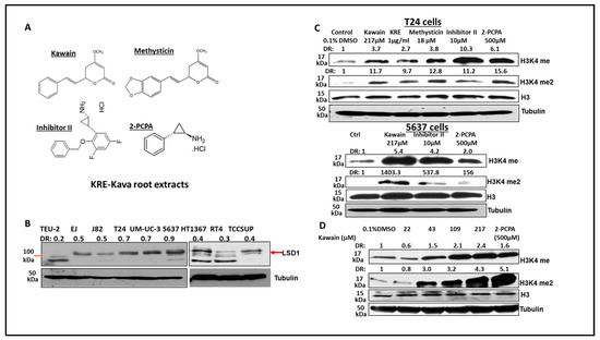Cell lines 5637 and T24 were obtained from ATCC (Manassas, VA, USA) and cultured in an RPMI growth medium enriched with 10% FBS. Kava root extract (KRE) at a concentration of 150 mg/mL kavalactones in 50% ethanol was obtained from Gaia Herbs (Brevard, NC, USA). Pure kawain and methysticin (99%) were purchased from LKT Laboratories, Inc. (St. Paul, MN, USA). LSD1 inhibitor II and 2-tranylcypromine (2-PCPA) were from Selleck Chemicals LLC (Houston, TX, USA). 5637 and T24 cells were tested for known species of mycoplasma contamination using a kit from Lonza, Inc. The 5637 and T24 cells were treated with 0.1% DMSO and different doses or concentrations of KRE, kawain, and methysticin for 24 h. After treatments, cells were lysed in a radio-immunoprecipitation assay (RIPA) buffer containing a protease inhibitor cocktail. After centrifugation, supernatants were collected and quantified for protein concentrations by the Bio-Rad protein assay as described previously [28]. Clarified protein lysates (60–100 µg) were denatured in 2x loading buffer at 100 °C and then resolved on 8–16% SDS-PAGE. Proteins were transferred to nitrocellulose membranes, probed with indicated antibodies, and visualized by an enhanced chemiluminescence detection system. β-tubulin was used as a loading control.
