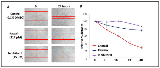 Kawain inhibits cell migration. (A) Microphotographs show repopulation of wounded areas of vehicle control (0.5% DMSO) or kawain or inhibitor II treated T24 cells. (B) Line graphs of widths of the gap with indicated treatments at 0, 8, 16, 24, and 48 h. Points are percentages of the widths of the gap related to control at 0 h.