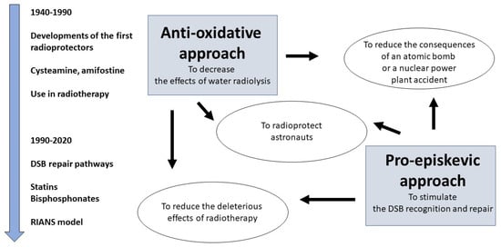 The radiation protection strategy with chemical agents has long been based on an antioxidative approach consisting in reducing the number of radical oxygen and nitrogen species responsible for the formation of the radiation-induced (RI) DNA damage, notably the DNA double-strand breaks (DSB), whose subset participates in the RI lethal effect as unrepairable damage. Conversely, a DSB repair-stimulating strategy that may be called the “pro-episkevic” approach (from the ancient Greek episkeve, meaning repair) can be proposed. The pro-episkevic approach directly derives from a mechanistic model based on the RI nucleoshuttling of the ATM protein (RIANS) and contributes to increase the number of DSB managed by NHEJ, the most predominant DSB repair and signaling pathway in mammalians. Here, three radioresistant and three radiosensitive human fibroblast cell lines were pretreated with antioxidative agents (N-acetylcysteine or amifostine) or to two pro-episkevic agents (zoledronate or pravastatin or both (ZOPRA)) before X-ray irradiation. The fate of the RI DSB was analyzed by using γH2AX and pATM immunofluorescence. While amifostine pretreatment appeared to be the most efficient antioxidative process, ZOPRA shows the most powerful radiation protection, suggesting that the pro-episkevic strategy may be an alternative to the antioxidative one. Additional investigations are needed to develop some new drugs that may elicit both antioxidative and pro-episkevic properties and to quantify the radiation protection action of both types of drugs applied concomitantly.
