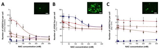 When the number of γH2AX foci was assessed 10 min post irradiation, the untreated radioresistant controls showed an average of 79.5 ± 1.5 γH2AX foci per cell, in agreement with the literature data and with a DSB induction rate of 37 ± 4 γH2AX foci per Gy per cell (p > 0.8) [45] (Figure 2B). After NAC pretreatment, the number of γH2AX foci assessed 10 min post irradiation was shown to decrease significantly by obeying a sigmoidal function of the NAC concentration in all the radioresistant controls. In these cases, all the correlation coefficients’ r were found higher than 0.9, and the lowest average value corresponded to 50.3 ± 1.5 γH2AX foci. The radiosensitive fibroblasts showed a significantly lower number of γH2AX foci without NAC pretreatment than radioresistant controls (p < 0.01), according to previous data [39]. The NAC pretreatment led to decrease the number of γH2AX foci assessed 10 min post irradiation, suggesting that millimolar concentration of NAC may significantly decrease the number of DSB induced by IR and recognized by NHEJ. However, the lowest average number of γH2AX foci reached with radiosensitive cells was not found significantly different from that reached by radioresistant controls (p > 0.1) (Figure 2B).