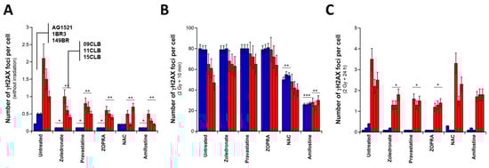 Radioprotective effect of a pretreatment with zoledronate, pravastatine and ZOPRA. Number of γH2AX foci per cell assessed in the indicated pretreatment and after the indicated pretreatment (A), followed by 2 Gy X-rays and 10 min (B) or 24 h (C) incubation. Each bar represents the mean ± standard error (SEM) of at least three replicates. The NAC and amifostine data are those already shown in Figure 3 and Figure 4 with pretreatment of 300 mM NAC and 96 mM amifostine. one, two and three asterisks indicate p < 0.05, p < 0.01 and p < 0.001, respectively, by comparison with untreated controls.