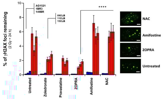 Relative radioprotective effect of a pretreatment with zoledronate, pravastatine, ZOPRA, NAC and amifostine. The data shown in Figure 3C are expressed as percentage of γH2AX foci remaining, calculated by dividing the number of γH2AX foci assessed 24 h post irradiation (Figure 4C) by the number of γH2AX foci assessed 10 min post irradiation (Figure 4B). Inserts show representative examples of untreated and ZOPRA, 300 mM amifostine and 96 mM NAC pretreated 09CLB nuclei with γH2AX foci assessed at the indicated conditions. White bar represents 5 µm. Four asterisks indicate p < 0.0001, respectively, between ZOPRA data and NAC and amifostine data.
