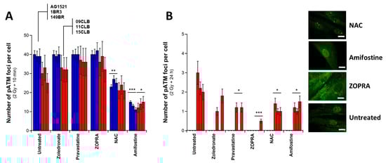 Recently, from 200 human fibroblast cell lines showing a large spectrum of radiosensitivity, we provided clues that some quantitative correlations exist between the cellular radiosensitivity of quiescent human cells and γH2AX and pATM biomarkers [42]. Other biomarkers such as DNA-PK foci, Ku expression, or cell-free plasmid end-joining assays were not chosen because of potential technical artifacts, low dose dependence and difficulties to extrapolate data to in vivo experiments, respectively [1,42,43]. Hence, here, by using the number of γH2AX and pATM foci as endpoints, the antioxidative approach (with NAC and amifostine, the most documented antioxidative drugs) and the pro-episkevic approach (with statins and bisphosphonates, the most documented pro-episkevic drugs) were compared with three radioresistant and three radiosensitive human quiescent fibroblasts, pretreated with drug concentrations already tested in the literature and exposed to IR. Our major goal is to better understand the molecular features of the radioprotection process by quantifying the reduction of the molecular effect induced by a reference IR dose (here, 2 Gy X-rays, mimicking a standard RT session) after a 24 h drug pretreatment.