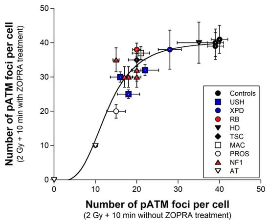Radioprotective effect of ZOPRA in fibroblasts from 10 genetic syndromes with pATM foci. The number of pATM foci assessed at 10 min post irradiation (X-rays) with and without ZOPRA pretreatment were plotted together. Fibroblasts were derived from the indicated syndromes: Usher’s syndrome (USH), PROS syndrome (PROS), McCune–Albright syndrome (MAC), retinoblastoma (RB), Tuberous Sclerosis Complex syndrome (TSC), Huntington Disease (HD), Xeroderma Pigmentosum D (XPD), Neurofibromatosis 1 (NF1), LIG4 syndrome (LIG4) and ataxia telangiectasia (AT). Note the AT data are obtained from historical data of the N.F. lab; all these data were published elsewhere [31,32,33,40,41,48,49,50]. Each point represents the mean ± standard error (SEM) of at least three replicates. Data were fitted to the following sigmoidal function: y = 40.53 + (40.10)/(1 + (x/12.797)3.51); r = 0.944.