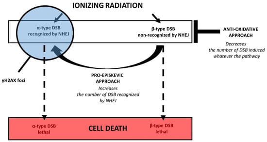 Schematic view of the molecular and cellular consequences of an exposure to IR inducing two types of DSB. The α-type DSB are recognized by the NHEJ DSB repair pathway, while the β-type DSB are not [38]. For each type of DSB, there are some subsets of unrepaired DSB [38]. Among them, some may be unrepairable and participate in the lethal effect. The γH2AX foci reveal the α-type DSB only. The antioxidative approach consists in reducing the number of DSB involved by IR, independently of the DSB repair pathways involved in their recognition. The pro-episkevic approach consists in increasing the number of DSB recognized by NHEJ by accelerating and facilitating the RIANS and therefore by stimulating the efficiency of NHEJ.