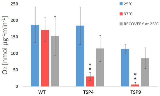 Initially, we characterized TSP9 by measuring OERs and PSII activity by fluorescence (Figure 1 and Figure 2, respectively). We used WT and TSP4 cultures as controls. For all strains, the blue bars correspond to the permissive temperature condition (25 °C), the red bars to the non-permissive temperature condition (37 °C), and the gray bars to the recovery condition (24 h at 25 °C, after 24 h at 37 °C).