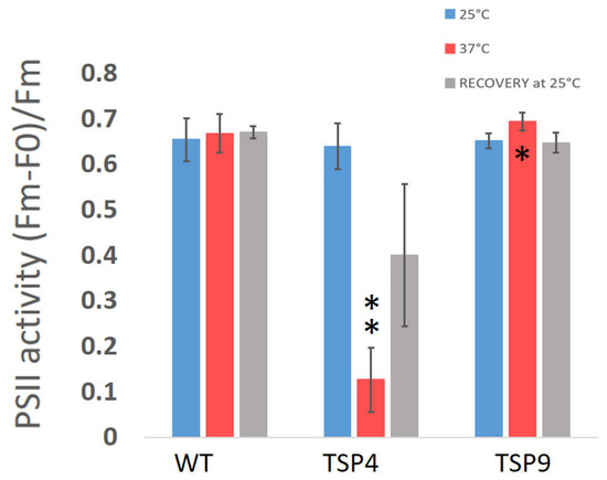 Unlike the TSP4 mutant, the TSP9 mutant showed a small difference from the WT in PSII activity in response to a high temperature. The significance was found at a p-value of 0.0032 (Figure 2 and Table S2b the Supplementary Materials).