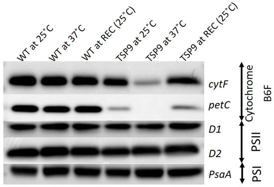 We used representative subunit-specific antibodies to examine the effects of elevated temperature on the presence of the PSI, PSII, cytochrome b6f, and ATP synthase complexes in isolated thylakoids from the WT and TSP9 strains (full western analysis can be found in Figure S4 in the Supplementary Materials). The immunoblot signals indicated no significant change in protein levels of the WT strain in response to temperature. The TSP9 mutant showed signals for all four photosynthetic complexes at the permissive temperature (25 °C). While there was some reduction in the levels of the petC (Rieske protein) signal, the levels of the cytF (petA) polyclonal IgG were similar to those of the WT strain. However, when adapted to the non-permissive temperature (37 °C), the TSP9 mutant showed a significant decrease in the level of cytF and complete elimination of the petC signal (Figure 3). PetC and cytF exhibited recovery upon return to the permissive temperature.