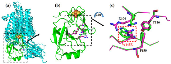 W143R mutation in Rieske protein of the cytochrome b6f complex, represented by two overlaid models: native (cyan and green) and the TSP9 mutant (magenta). (a) The cytochrome b6f complex from the membrane plane view, with the Rieske protein colored in green, and the rest of the subunits shown in cyan. (b) Close-up of the Rieske protein alone, from the membrane plane view. The 2Fe-2S cluster in orange and yellow can be seen in the proximity of the affected amino acids. (c) Close-up view of the W143R mutation site (red box) and the affected neighboring residues, arginine (R104), tyrosine (Y116), and phenylalanine (F150). The model view was rotated by 180 degrees to better show the mutation site.