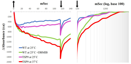 The WT cells exhibited similar kinetic properties regardless of the temperature change. The TSP9 cells grown at 25 °C showed similar kinetic properties when compared with the WT cells. However, when adapted at 37 °C for 24 h to eliminate the cytochrome b6f complex, the TSP9 cells showed a significant change in P700 photooxidation level, likely due to the lack of electron flow from PSII through PC when illuminated.