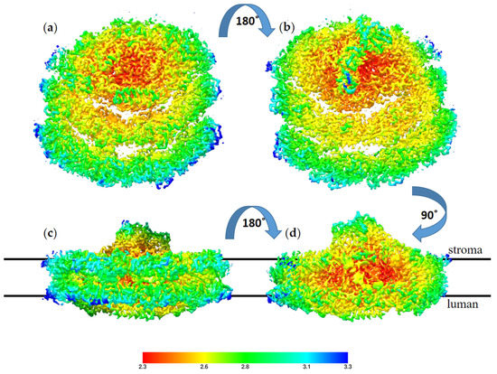 with red for the best resolution at 2.3 Å and blue for the resolution at 3.3 Å. The structure is shown from four angels: (a) view from the luminal side, (b) view from the stromal side, (c) view from the PsaD pole of the membrane plane, and (d) view from the LHC pole of the membrane plane. The stroma and lumen positions are marked for the membrane plane structures.