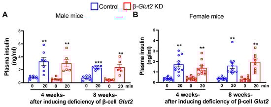 β-cell Glut2 knockdown (β-Glut2 KD) mice have normal glucose-stimulated insulin secretion. Fasting (6 h) plasma insulin levels (0 min) and glucose-stimulated insulin secretion (20 min) in male, n = 6 or 7 (A) and female, n = 8, 10, or 11 (B) mice 4 and 8 weeks after inducing β-cell Glut2 deficiency. The mice were 8–10 weeks old when β-cell Glut2 deficiency was induced. Repeated measures two-way ANOVA followed by Bonferroni’s multiple comparison test were used for comparisons. ** p < 0.01, *** p < 0.001 vs. their corresponding baseline (0 min) groups. Error bars are mean ± SEM.