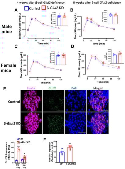 As global Glut2 knockout mice display impaired glucose homeostasis [7], we determined whether deficiency of β-cell Glut2 in adult mice recapitulates this defect. We performed oral glucose tolerance tests four and eight weeks after inducing β-cell GLUT2 deficiency in 8-week old male and female β-Glut2 KD mice. The mice have normal glucose tolerance (Figure 3A–D) despite the deficiency of β-cell Glut2. Moreover, β-Glut2 KD mice have 6 h fasting (Female, 169.8 ± 7 vs. 166.3 ± 8.6; Male, 189.5 ± 9 vs. 190 ± 4 mg/dL, Control vs. β-Glut2 KD mice, n = 6) and random non-fasting (Female, 206 ± 14 vs. 213 ± 11; Male, 217 ± 9 vs. 223 ± 16 mg/dL, Control vs. β-Glut2 KD mice, n = 6) blood glucose levels similar to that observed in their littermate control mice. As some reports have suggested the contribution of other glucose transporters such as GLUT1 to mediating glucose transport and metabolism in absence of GLUT2 [16,17], we measured protein levels and gene expression of islet Glut1 using immunofluorescence and qRT-PCR in female mice. We found that islet Glut1 was increased in female β-Glut2 KD mice compared to their littermate controls (Figure 3E,F). This increase was predominantly in insulin-positive cells (β-cells) as quantified using ImageJ software (Figure 3E). Overall, these findings indicate that normal level of β-cell GLUT2 is not necessary for regulating systemic glucose homeostasis.