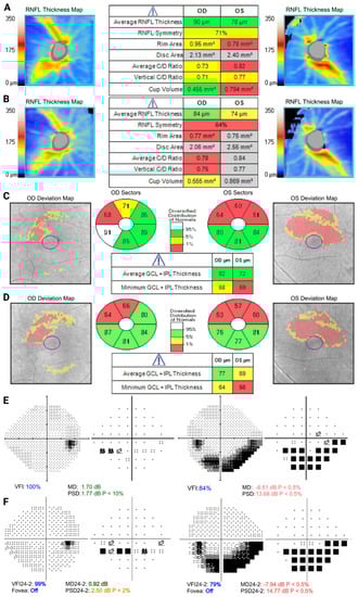 Figure 1. Optical coherence tomography (OCT) and visual field examination of patient 1 at baseline (top) and 5-year follow-up (bottom). (A) Retinal nerve fiber layer demonstrates stable mild right inferior thinning and more pronounced left superior thinning, with progression more pronounced in the left eye over time (B). (C,D) Bilateral superior–temporal ganglion–cell complex defects, worse in the left eye. (E) Visual field shows a mild early inferior nasal arcuate defect in the right eye and a denser inferior arcuate in the left eye, which progressed over time (F).