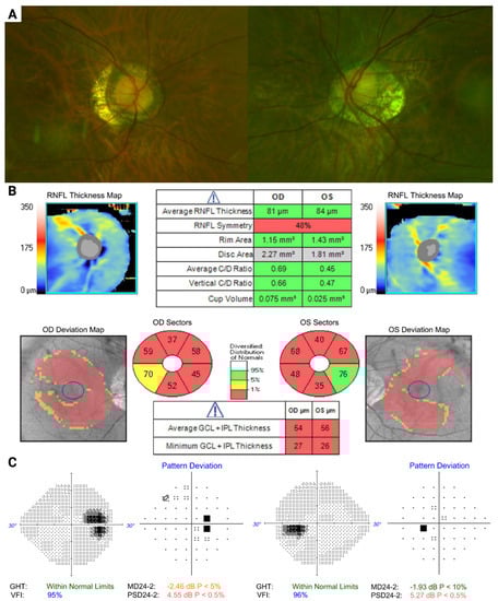 A 59-year-old Asian male with a myopic prescription of −8.0 D OD and −7.0 D OS presented with evidence of progression in his visual field defects over five years of follow-up. He had a diagnosis of NTG, and his IOPs had been stable in the mid-teens for several years on topical medications. Optic disc examination revealed slightly tilted, cupped discs with mild peripapillary atrophy. OCT RNFL demonstrated stable mild right inferior thinning, and more pronounced left superior thinning, with bilateral superior–temporal ganglion–cell complex defects (Figure 1A). The visual field showed a mild early inferior nasal arcuate defect in the right eye, and a denser inferior arcuate in the left, both of which had progressed gradually over time (Figure 1B,C). These changes are all in keeping with glaucomatous optic neuropathy, with myopia being a pre-disposing factor. Given the proximity to fixation, and evidence of progression, this patient was recommended further therapy to lower IOP, with a target likely in the single digits.