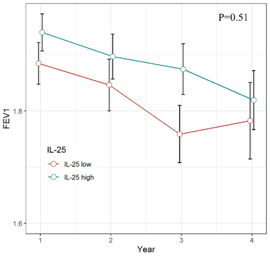 Differences in lung function trajectory between IL-25-low and IL-25-high groups.