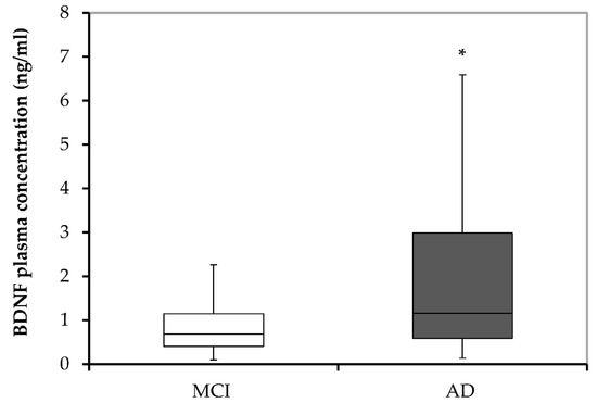 BDNF plasma concentrations in MCI subjects and patients diagnosed with AD. AD, Alzheimer’s disease; BDNF, brain-derived neurotrophic factor; and MCI, mild cognitive impairment. * p < 0.001 vs. MCI.