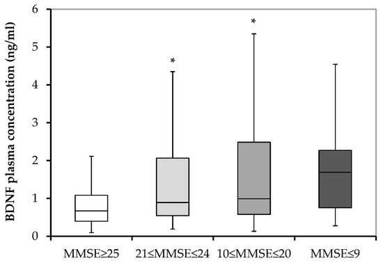 BDNF plasma concentrations in all subjects subdivided into those with normal cognition (MMSE ≥ 25), those with mild dementia (21 ≤ MMSE ≤ 24), those with moderate dementia (10 ≤ MMSE ≤ 20) and those with severe dementia (MMSE ≤ 9). BDNF, brain-derived neurotrophic factor; and MMSE, Mini-Mental State Examination. * p ≤ 0.050 vs. MMSE ≥ 25.
