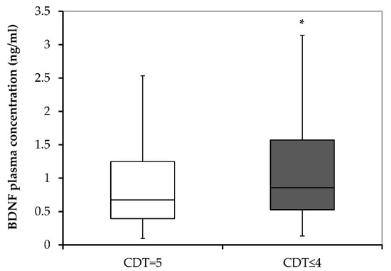 BDNF plasma concentrations in subjects subdivided into those with normal cognition (CDT = 5) and those with cognitive disturbances (CDT ≤ 4). BDNF, brain-derived neurotrophic factor; and CDT, Clock Drawing test. * p < 0.001 vs. CDT = 5.